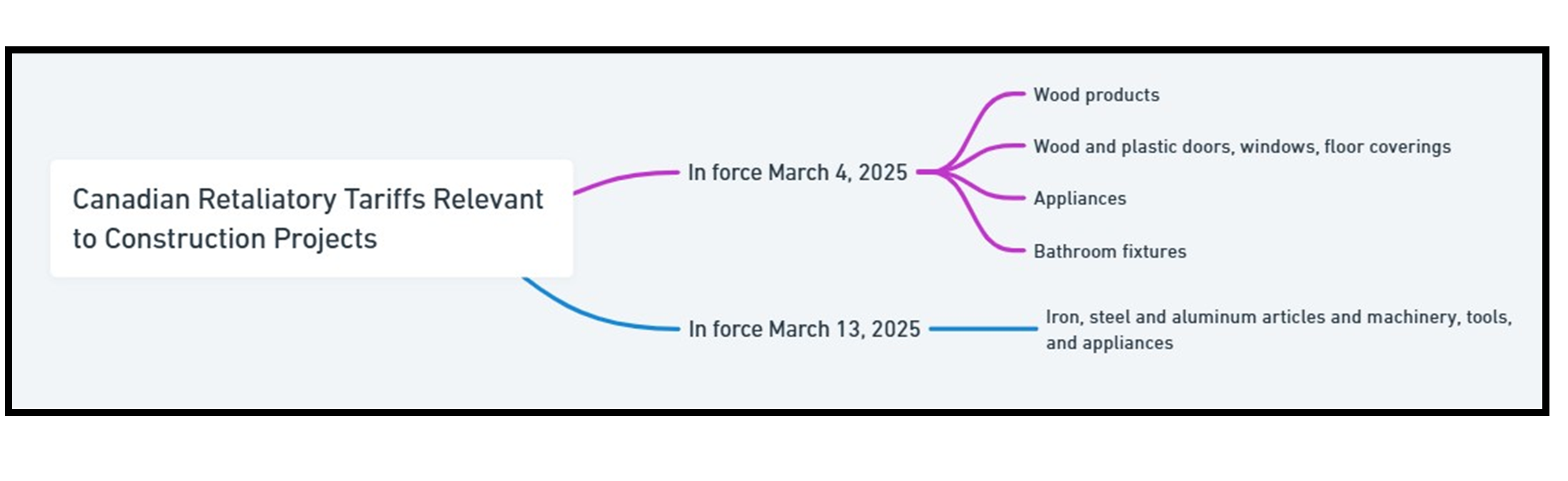 The Canadian retaliatory tariffs reportedly include a 25% surtax on various U.S. origin goods, many of which are relevant to construction projects, as outlined below: